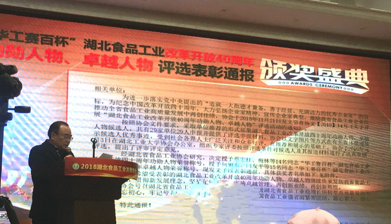 武漢華工賽百數(shù)據(jù)系統(tǒng)有限公司總經(jīng)理、湖北省食品工業(yè)協(xié)會副會長楊肖作為特邀頒獎嘉賓,宣讀了本次“華工賽百杯”湖北食品工業(yè)改革開放40周年功勛人物、卓越人物評選表彰決定,共有29家單位29人獲得了此次殊榮,獲獎代表分享了感言和事跡報告,獲得了在場同行、專家等一致贊譽!
